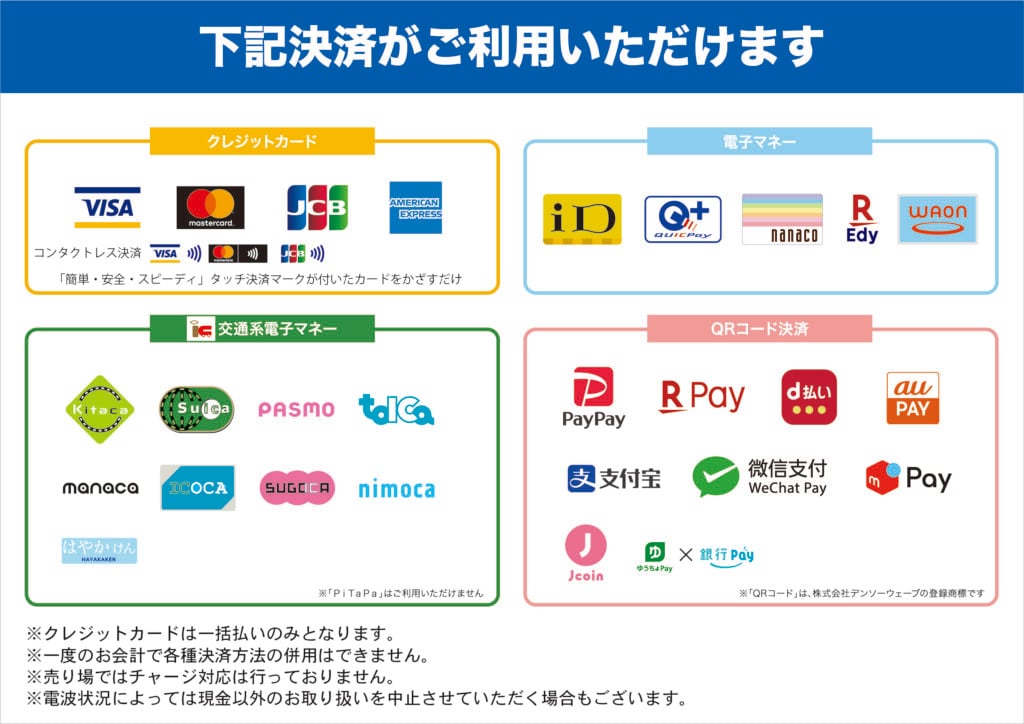 ・通信状況により、キャッシュレス決済のお取り扱いを中止させて頂く場合がございます。